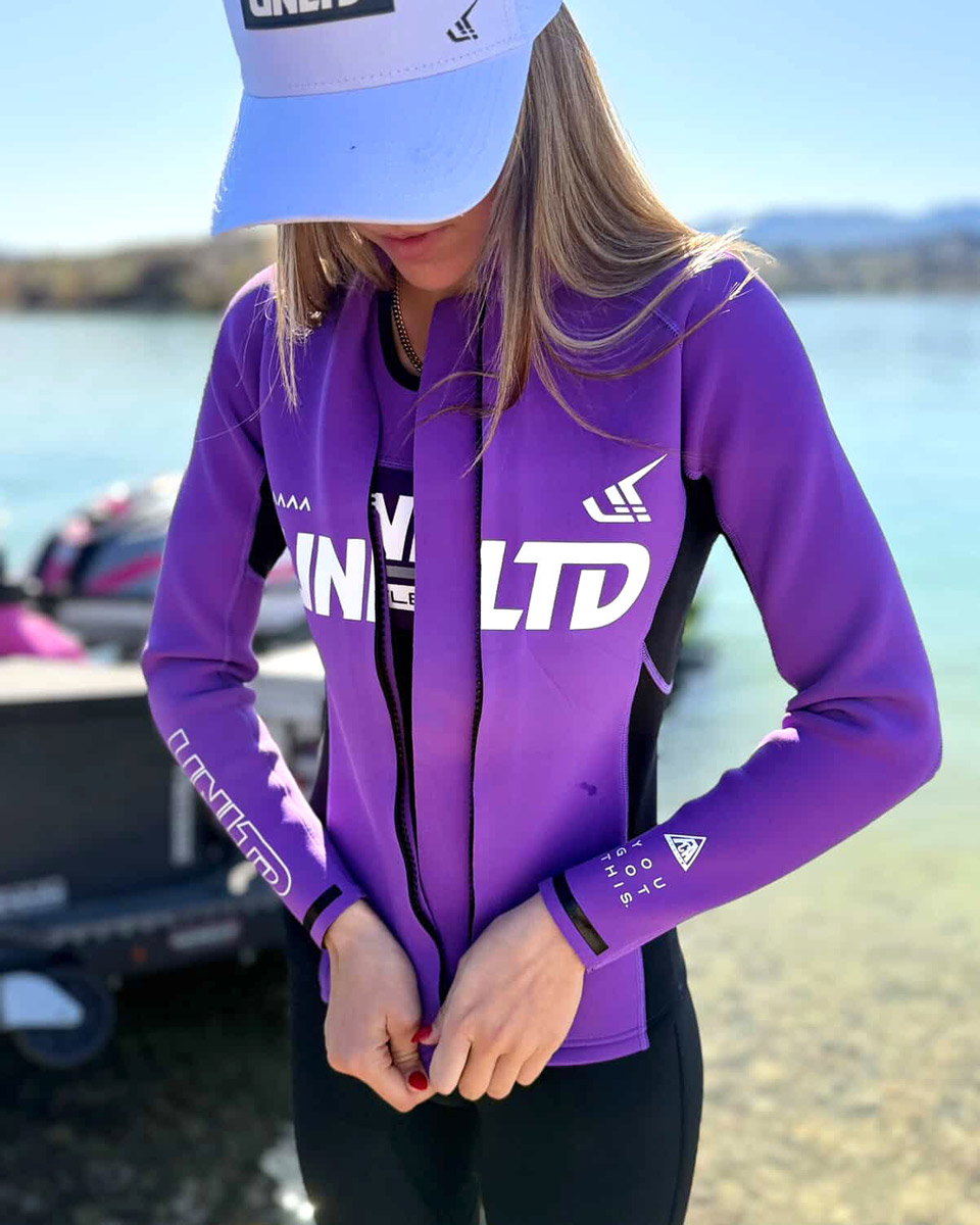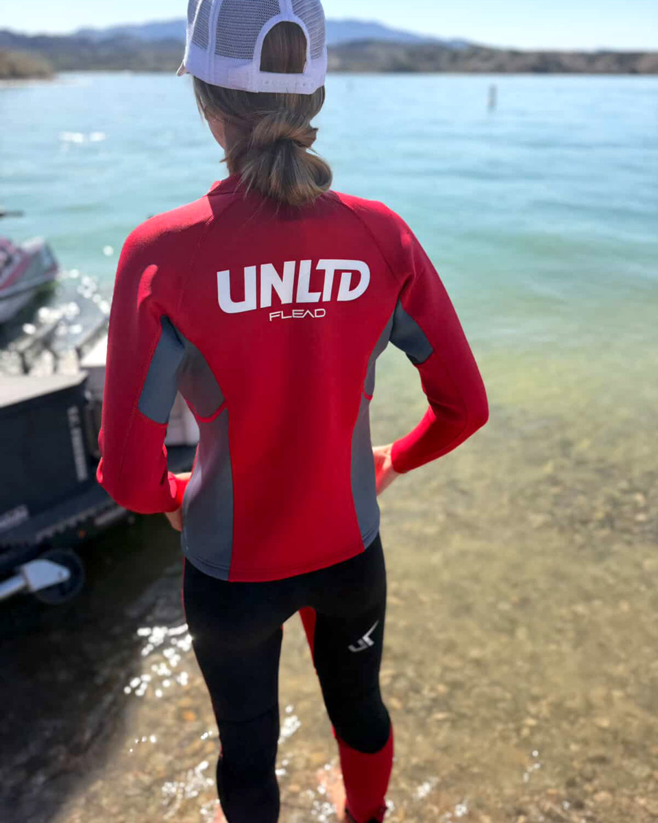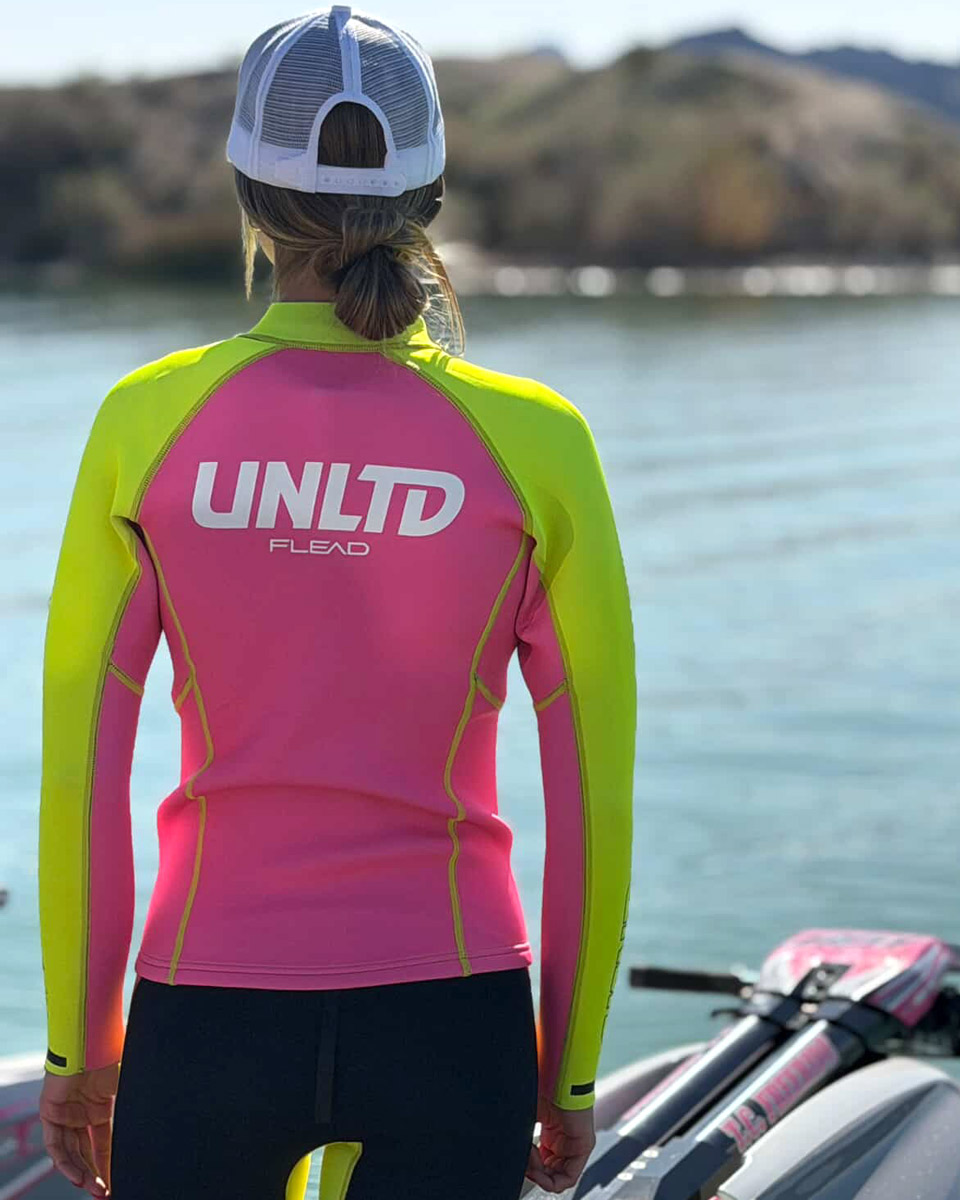 サイドカットはボディラインを美しく整え、スマートでスタイリッシュな印象を与えます。UNLIMITED FLEAD – ピークパフォーマンスの追求 UNLIMITED専属プロライダー監修のもと、 PWC(パーソナルウォータークラフト)のパワー・スピード・安定性を最大限に引き出すことに徹底的にこだわったウェットスーツデザイン。 現代のライダーにとって、モダンなスマートさを体現した究極のギアです。